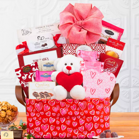 They will love this Ghirardelli assortment exclusive. Ghirardelli double chocolate cocoa, dark chocolate wafers, chocolate chip cookies, a collection of Ghirardelli squares that include; dark chocolate with caramel, dark chocolate 60% cacao, milk chocolate and dark chocolate with caramel sea salt and Ghirardelli dark chocolate with raspberry filling bar complete this charming Valentine arrangement.